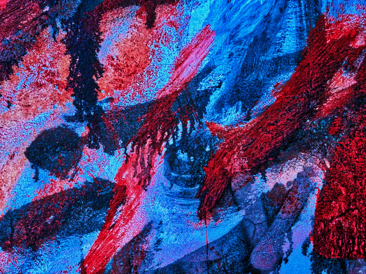 Al primo impatto l'occhio vede pennellate, campiture, macchie di colore rosso, nero e azzurro variamente articolate, sovrapposte, interferenti, che si avvicinano allontanano incontrano scontrano convergono divergono si ergono slittano si attraggono respingono si ricompongono e scompongono. È l'occhio, mobile, dinamico, che si immerge nella matassa di colori e scruta in profondità.